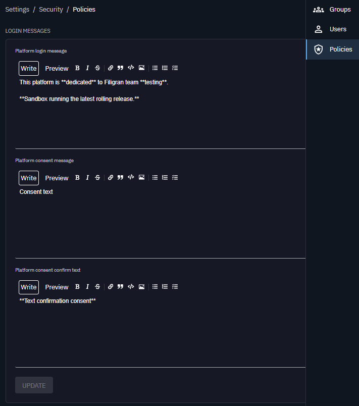 The Policies configuration page, located under Settings > Security > Policies, is designed to manage and customize various security-related settings. This page currently includes the configuration of login messages, with plans to expand its capabilities in the future.