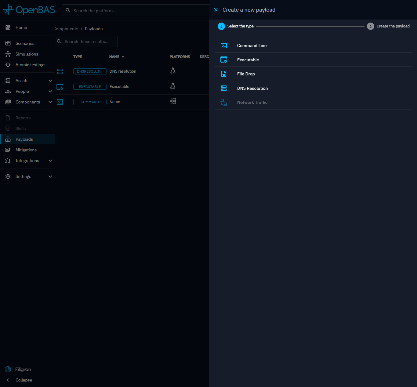 In OpenBAS, you can create custom payloads based on different types to create new injects.