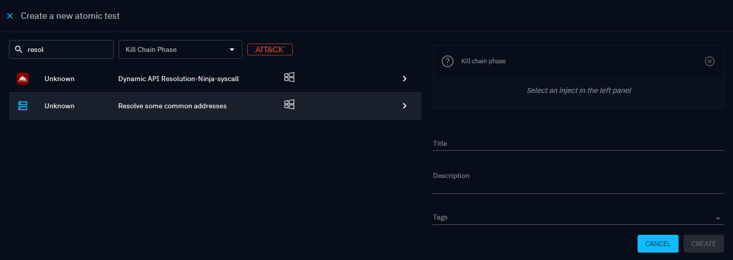 After creation, a new inject type will automatically appear in the inject types list if the implant you're using supports it (the OpenBAS Implant does).