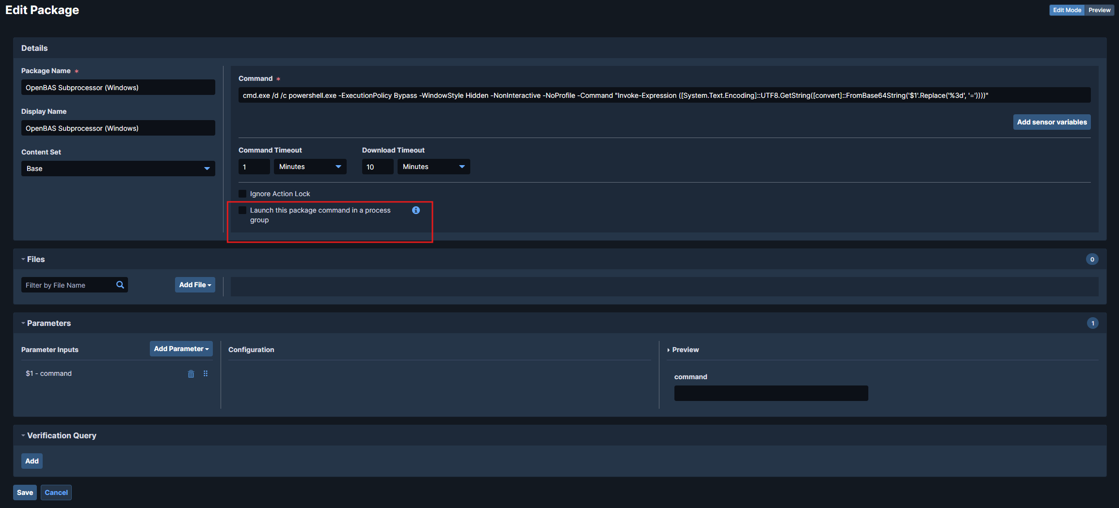 Because OpenBAS should run implants as detached processed, you must uncheck the box "Launch this package command in a process group" in the package configuration: