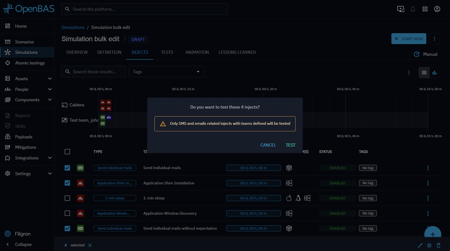 Select the injects you want to test then click on the bug icon. A confirmation dialog appears, you can cancel or confirm the launch of the test.
