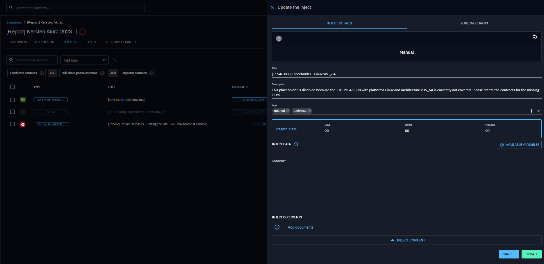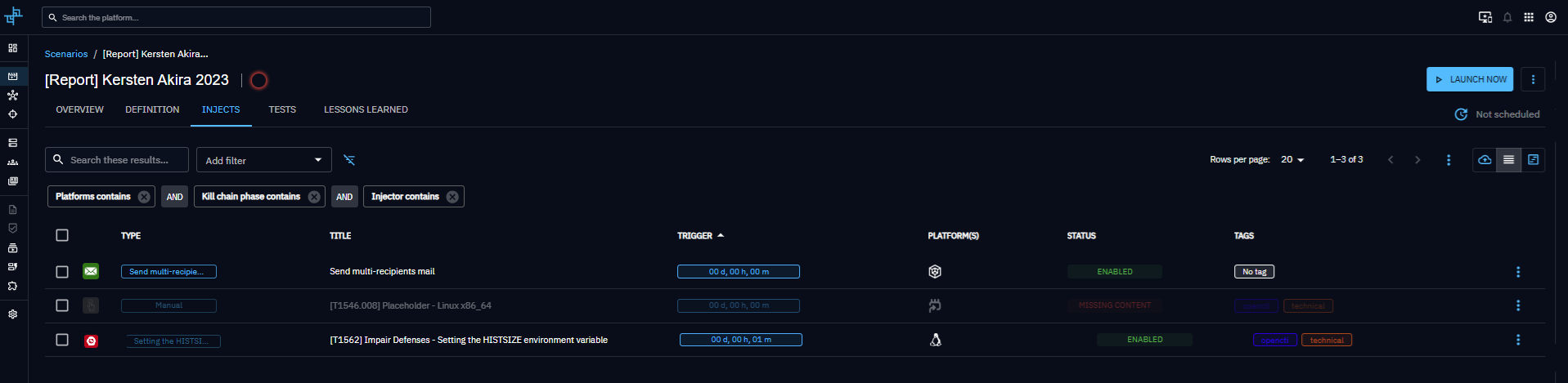 It’s essential to understand that a scenario creation for these entities relies on matching TTPs between OpenCTI and OpenBAS. You’ll need to ensure that the TTPs in both platforms are aligned. For instance, if your report contains the TTP T1059.001, a scenario can be created with an inject, provided OpenBAS also includes T1059.001. Otherwise, an inject with a placeholder will be created instead for this TTP.