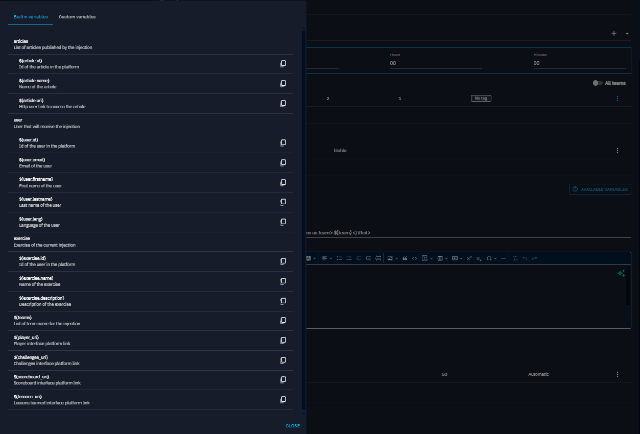 Within certain injects, users can leverage a set of predefined built-in variables to dynamically customize content. These variables are designed to streamline the process of personalizing messages. Examples of built-in variables include but not limited to :