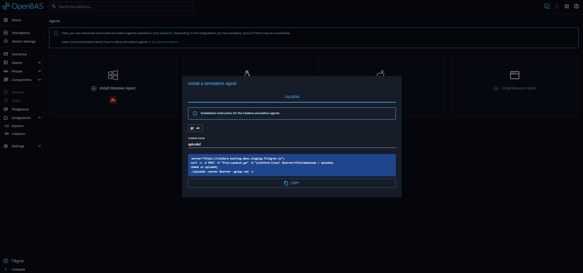 As of now, only the Caldera injector requires the installation of an agent. This agent enables full integration with the MITRE Caldera framework, unlocking advanced simulation capabilities and enhancing the overall effectiveness of simulation exercises. Full details of the Caldera agent are available in the MITRE documentation.