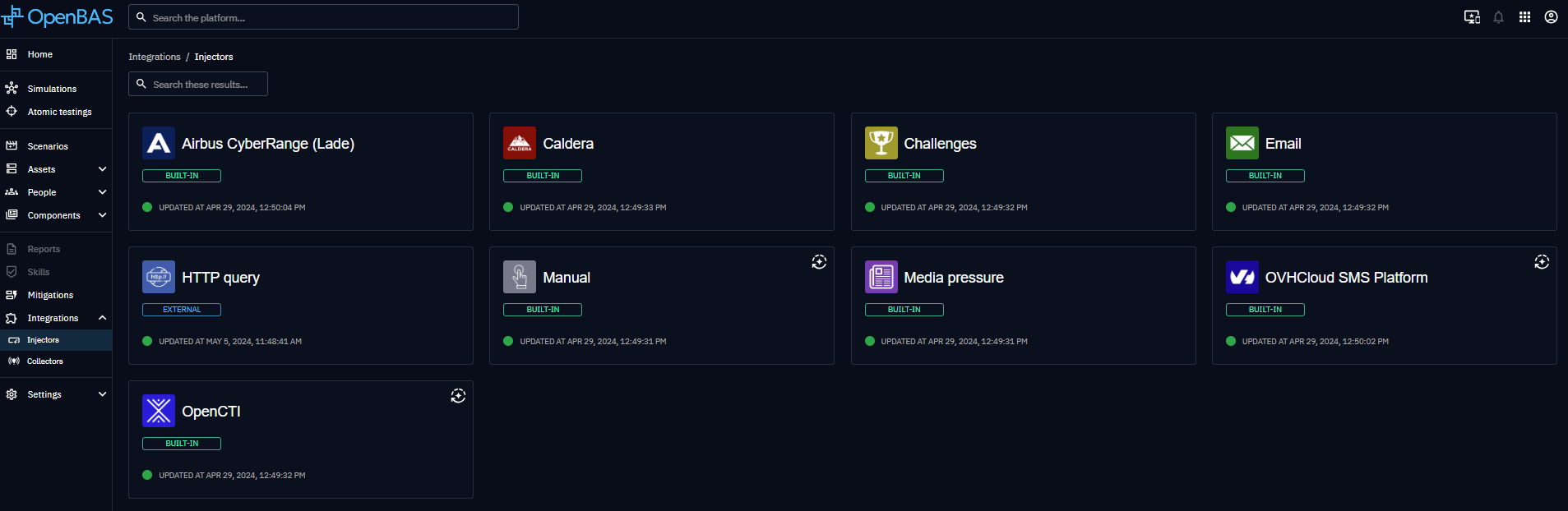- Caldera: Facilitates the use of the MITRE Caldera framework, empowering administrators to leverage advanced simulation capabilities. For more information concerning the Caldera injector, please refer to the dedicated documentation page.