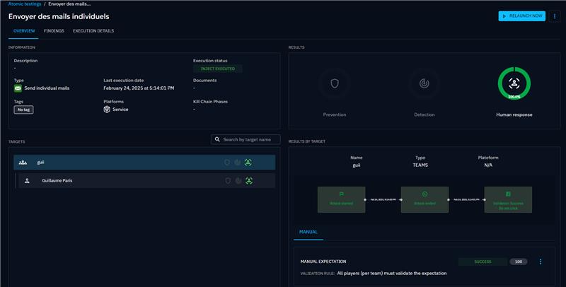 As for Simulation and Scenario, Results are broken down into: - Prevention: the ability of your security posture to prevent the inject - Detection: the ability of your security posture to detect the inject - Human response: the ability of your security teams to react as intented facing the inject