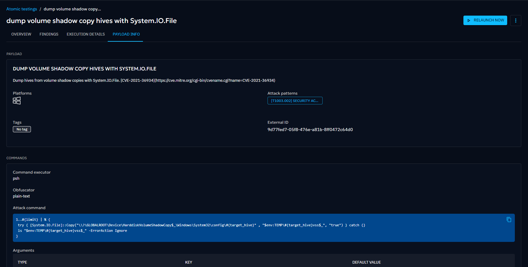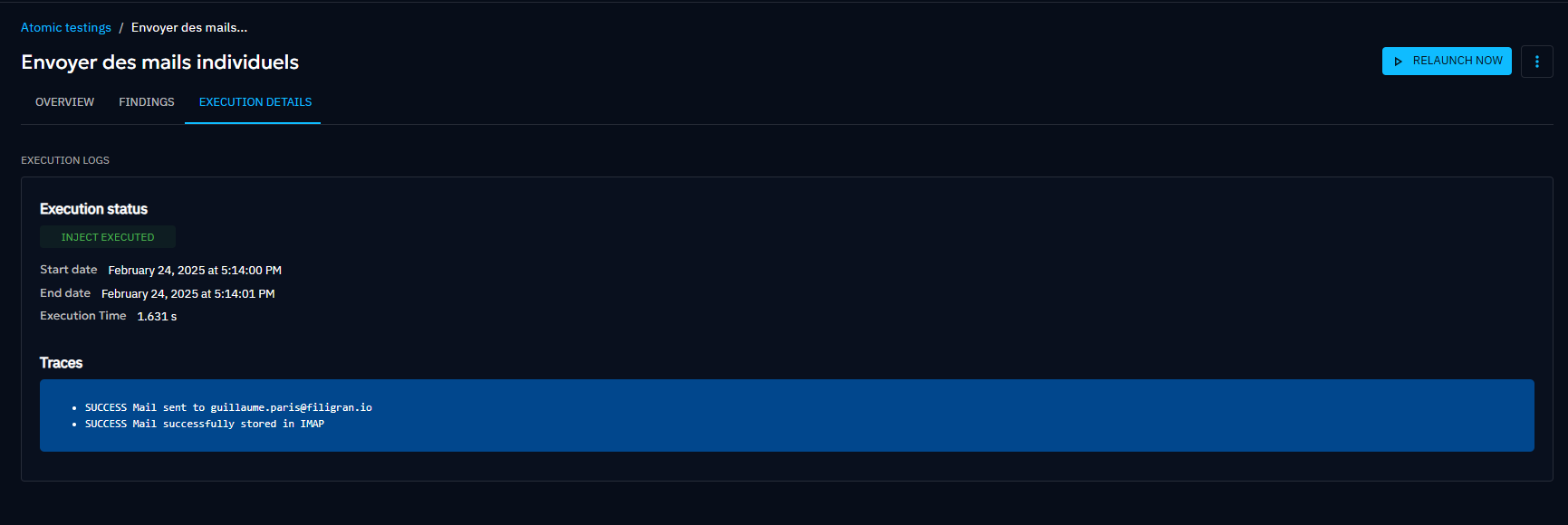 On this screen, you can retrieve details about the configuration, the command lines (if relevant) and the execution logs of the atomic testing and its expectations.