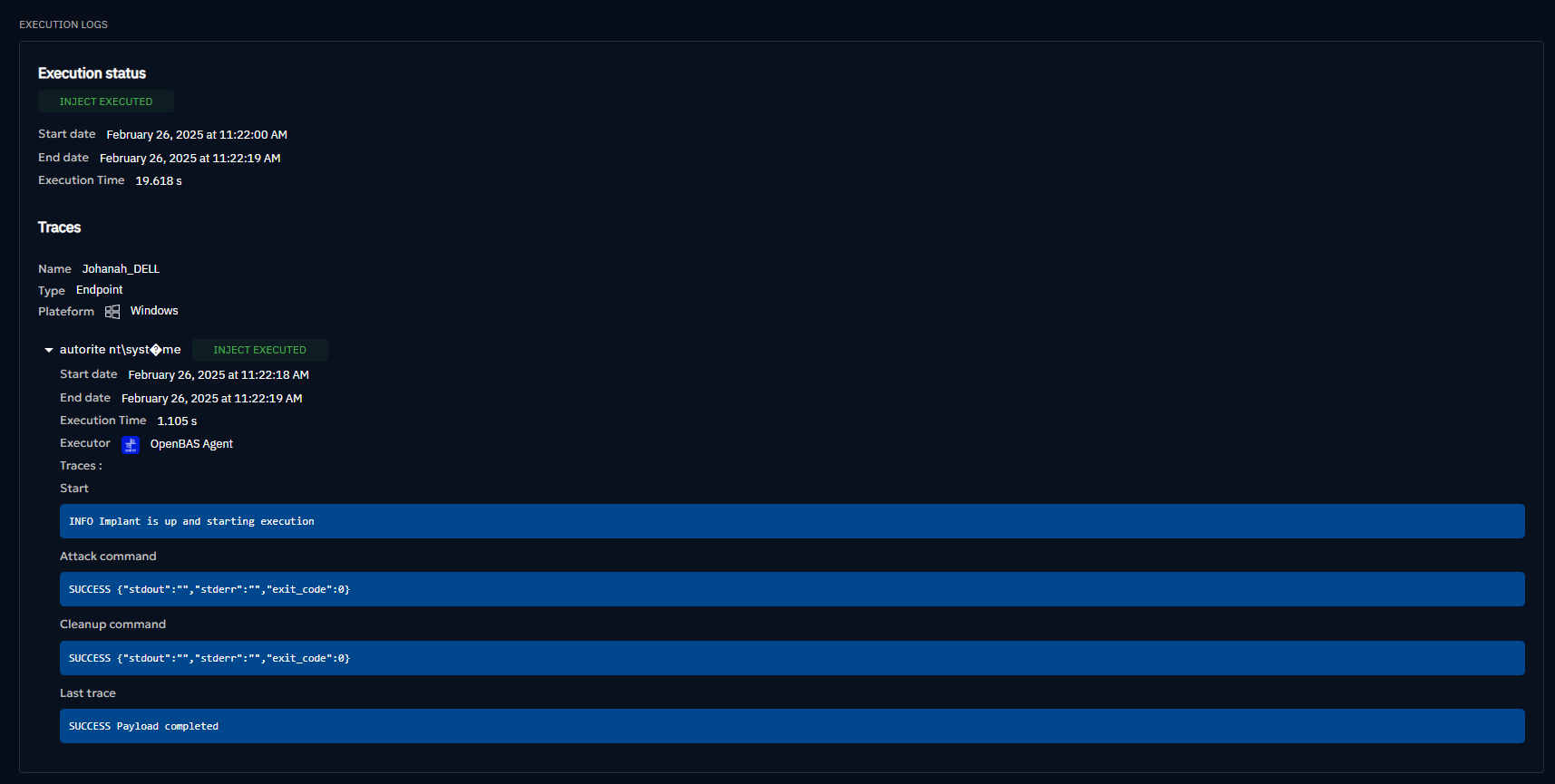 For technical injects, you can see the raw execution logs of the agents that executed the test.
