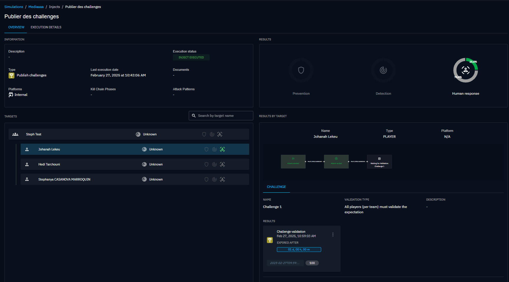 The initiator of the simulation can check the results. On this picture, a player of the team answered correctly while the others have not answered yet. Note that by default, players have a day to respond.