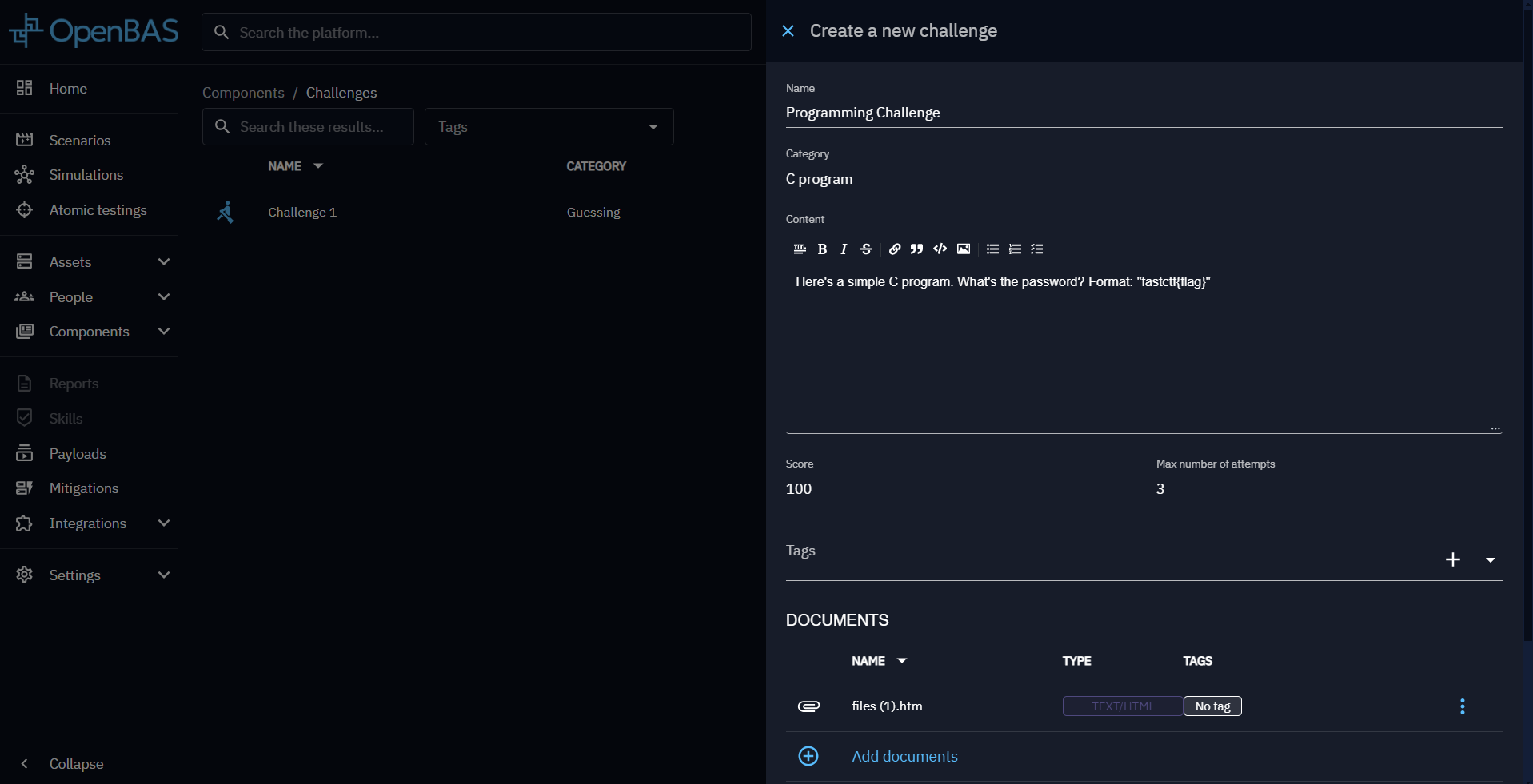 Challenges are integral to handling CTF (Capture The Flag) activities on the OpenBAS platform. You can define your challenge and the flags that need to be found to complete it.
