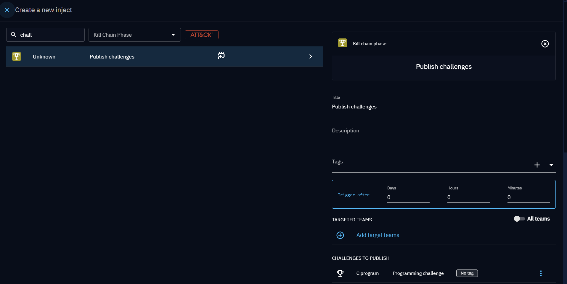 Challenges can be utilized in Scenarios and Simulations. When creating an inject of type "Publish challenges," you need to select a challenge to be sent to your players.