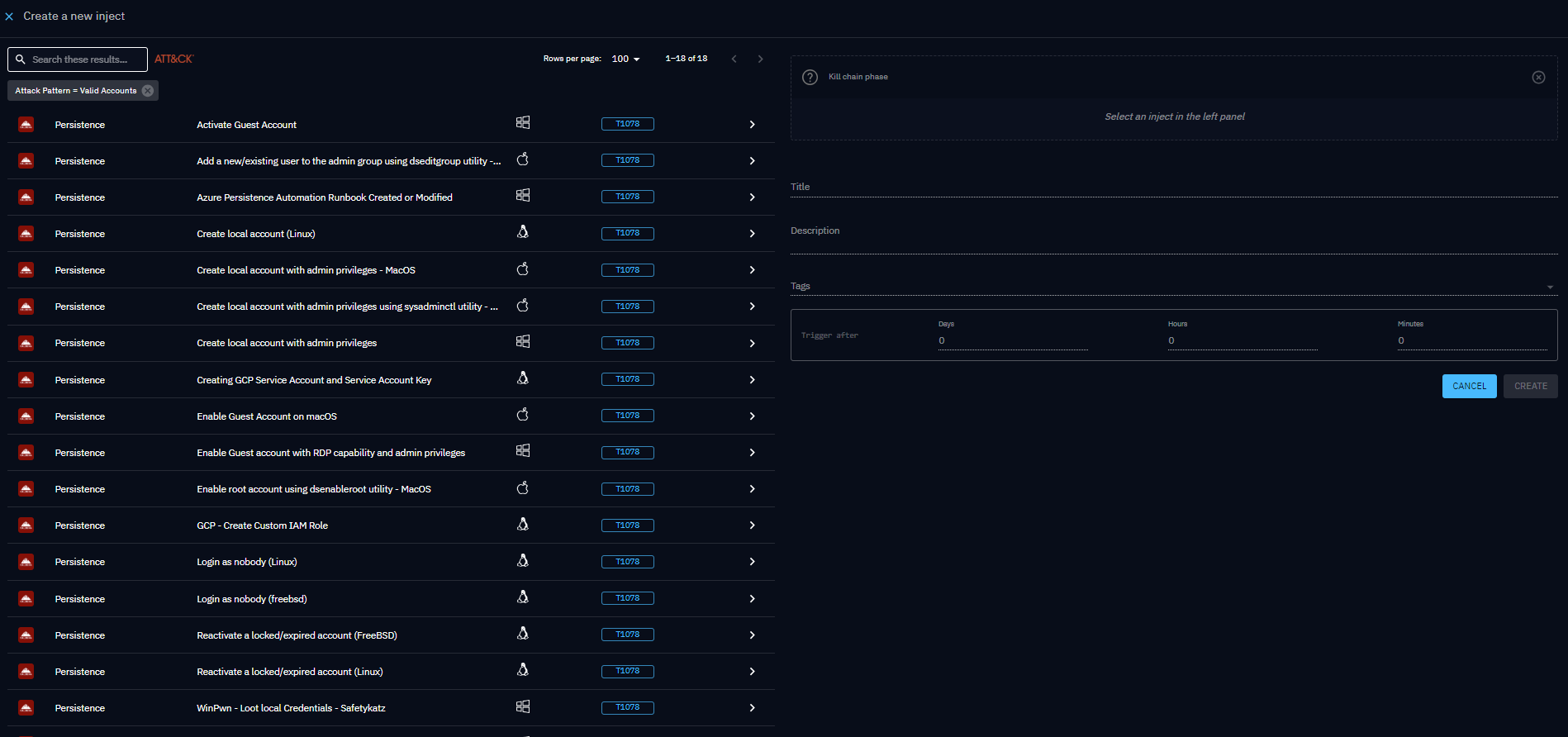 To facilitate the selection into this possibly very long list, you can search injects by name and filter the list by selecting a precise MITRE ATT&CK techniques for instance.