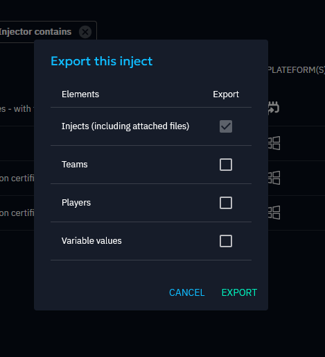 This feature enables seamless sharing of injects across different environments, ensuring flexibility and efficiency in exercises.