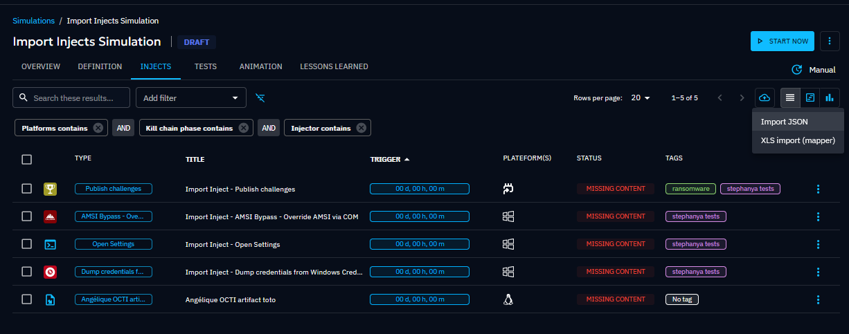 - Injects from any source (atomic testing, scenarios, or simulations) can be imported into any other instance ( scenarios, simulations, or atomic testing).