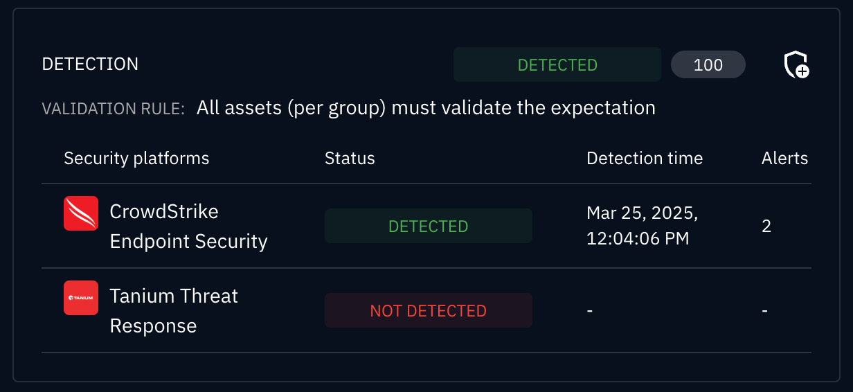 By clicking on the OpenBAS agent, we can see that the inject's payload was already detected by the CrowdStrike Falcon EDR while more detections might arrive at a later point. We can also see that there was one alert identified on CrowdStrike Falcon EDR.