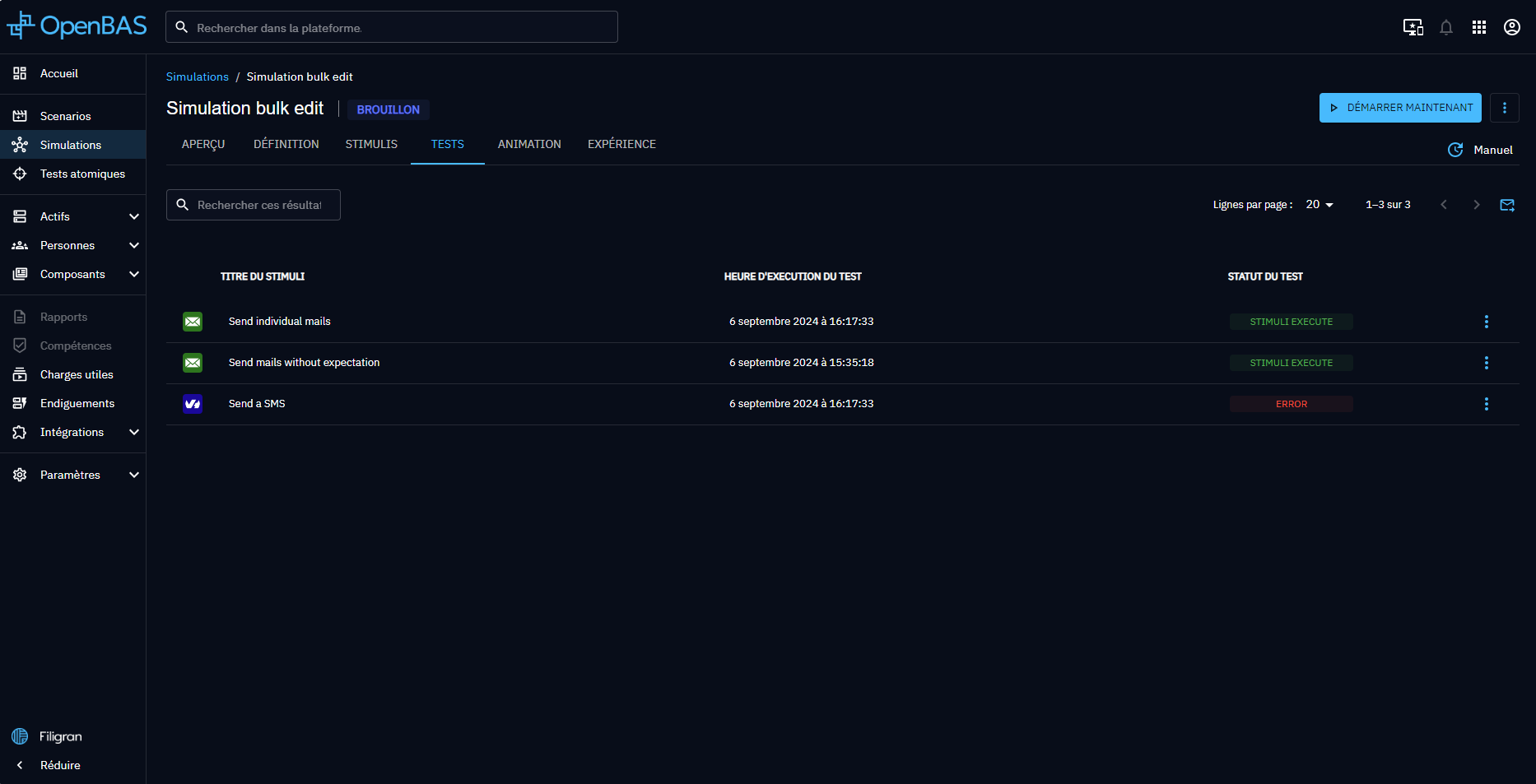 A "Tests" tab is available in simulations and scenarios. The list of all the tests done on the injects of the simulation/scenario are displayed. Clicking on one of the lines opens the drawer with the execution details of the tests.