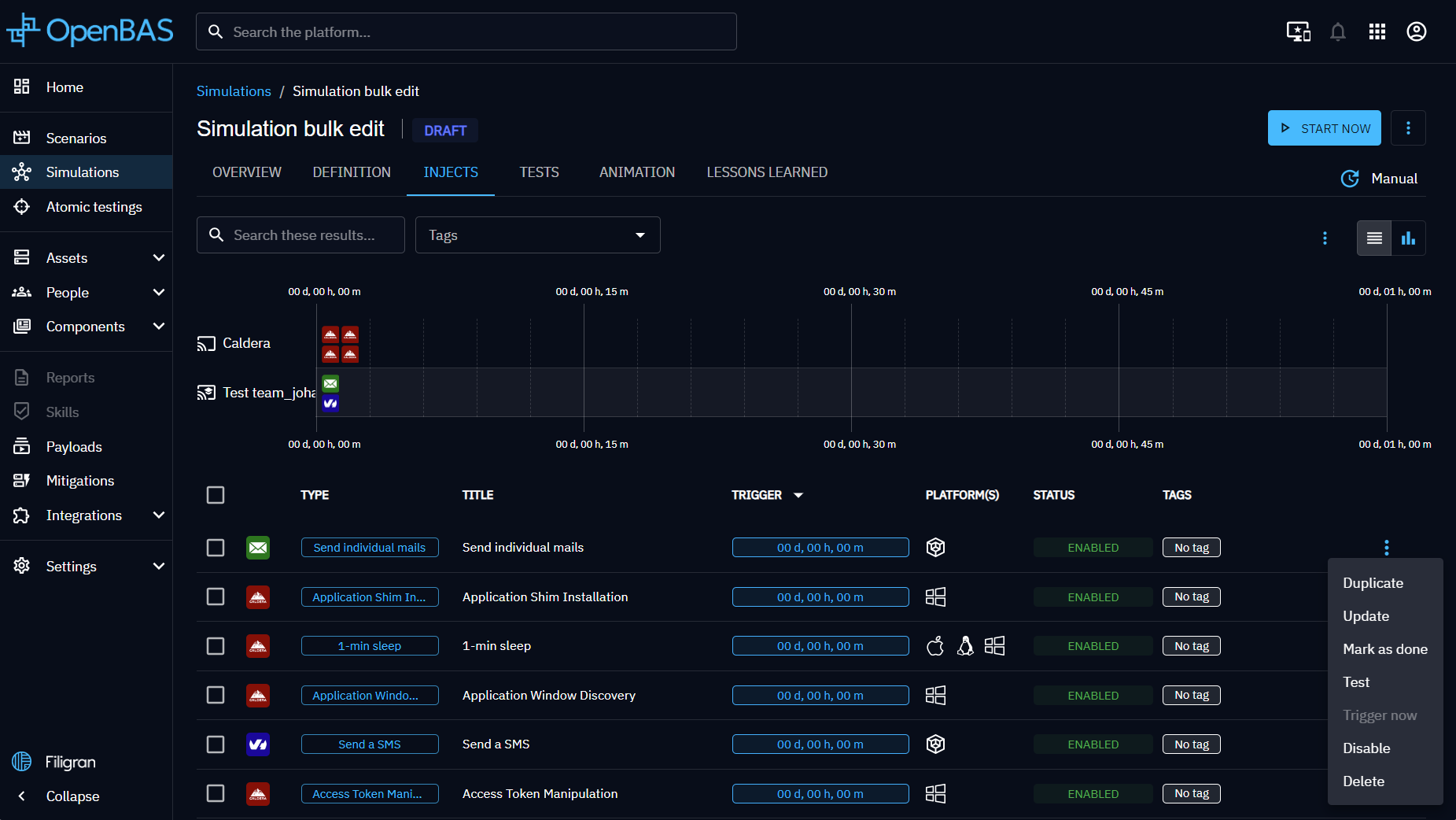 Injects are fundamental elements of simulations within OpenBAS, each representing a discrete action to be executed during a Scenario. Managed and facilitated by various injectors, each inject type serves a distinct purpose, contributing to the comprehensive evaluation of defenses.