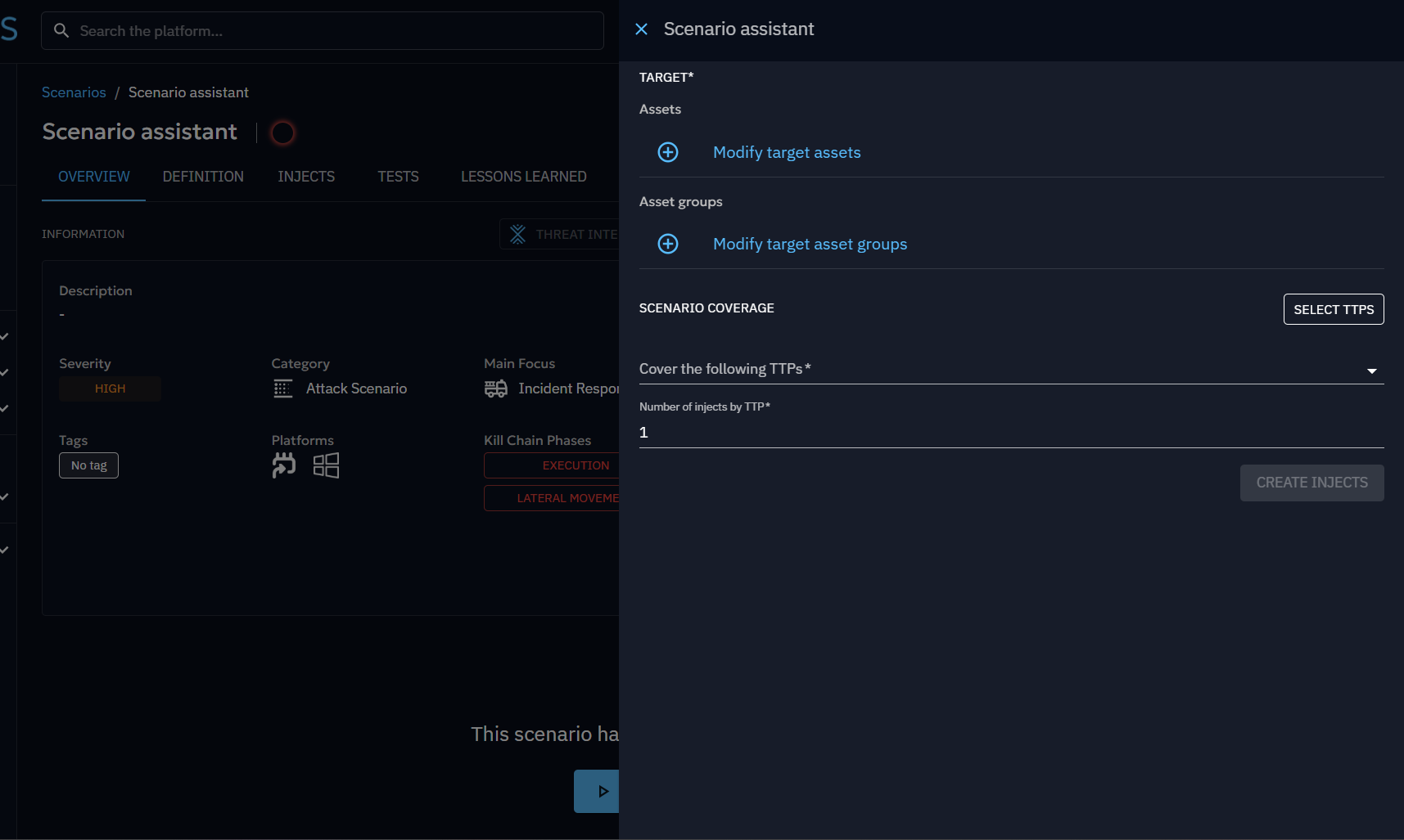 The Scenario Assistant generates injects based on your selected TTPs, ensuring compatibility with the platform architectures of your chosen endpoints or asset groups.