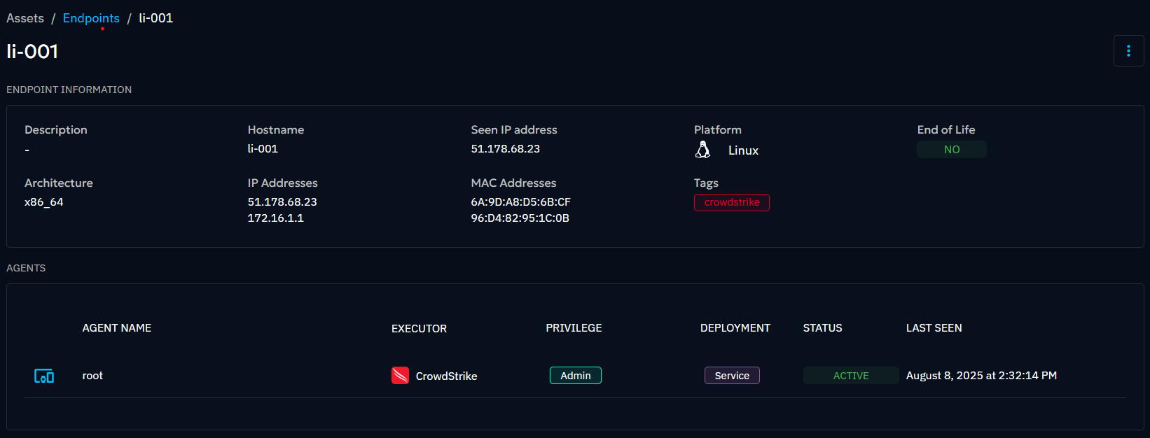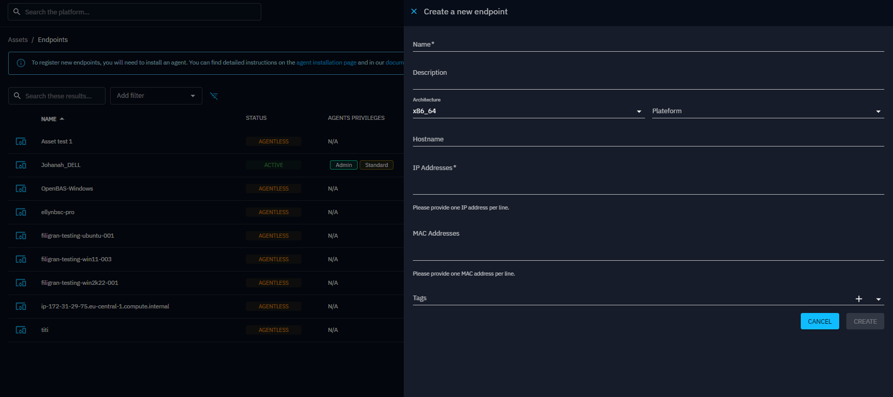 In order to provide flexibility in environments where agents cannot be deployed or when working with theoretical scenarios or sensitive systems, our platform allows users to manually create endpoints. Since they are manually created, they have the Agentless status.