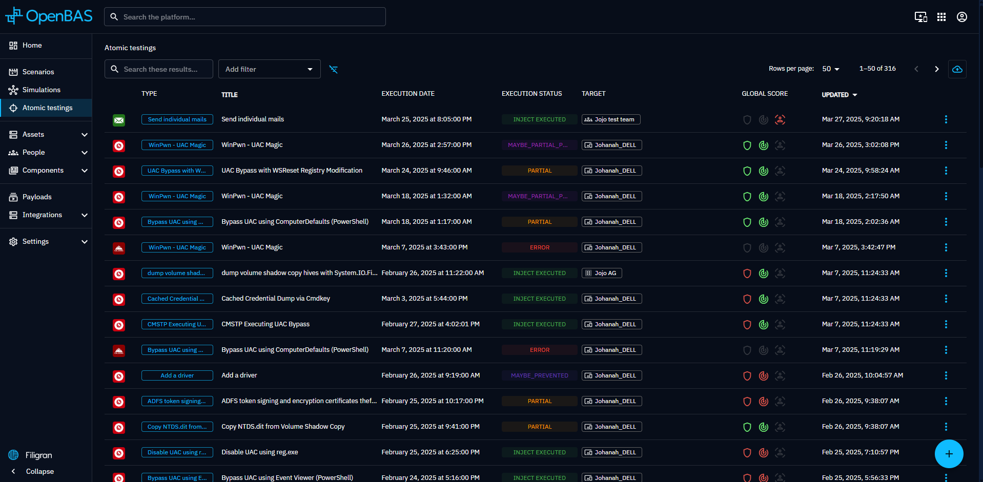 When clicking on Atomic testing in the left menu, you access to the list of all atomic testings ever launched in the platform.