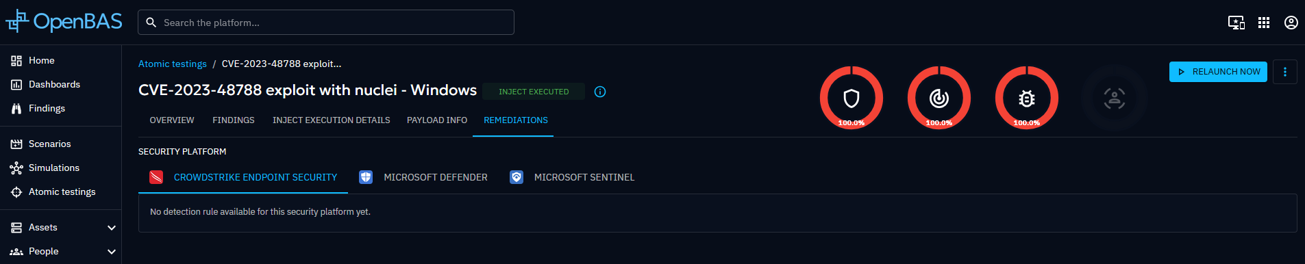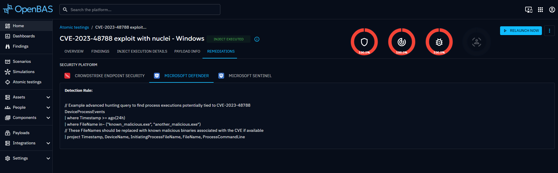 This screen is available for technical injects only. It displays remediation content related to the executed payload, specifically focused on detection logic. You will see one Remediation tab per collector available in the platform.