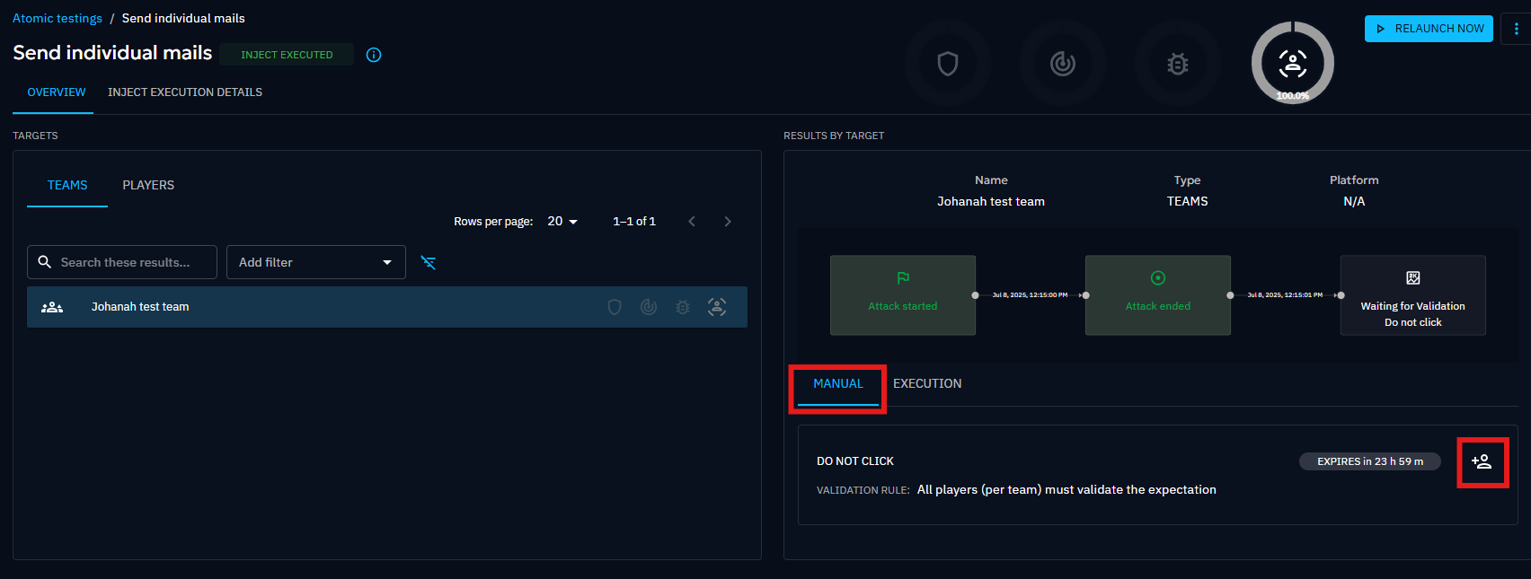 If you have created an atomic testing with a manual inject, you will validate it in the overview tab.