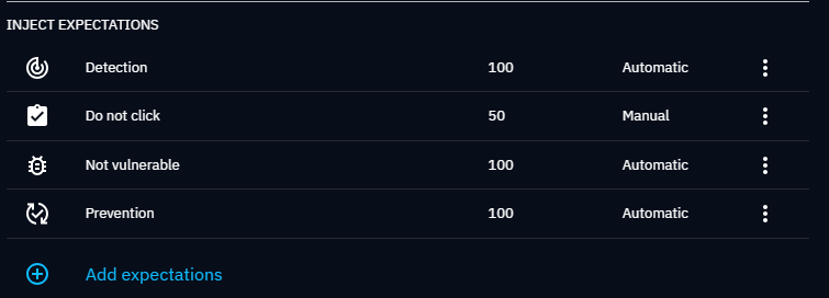Expectations define what is expected from an Asset (endpoint) or a Players when facing an Inject in terms of security posture. Each expectation has a score representing how well it has been met by the target.
