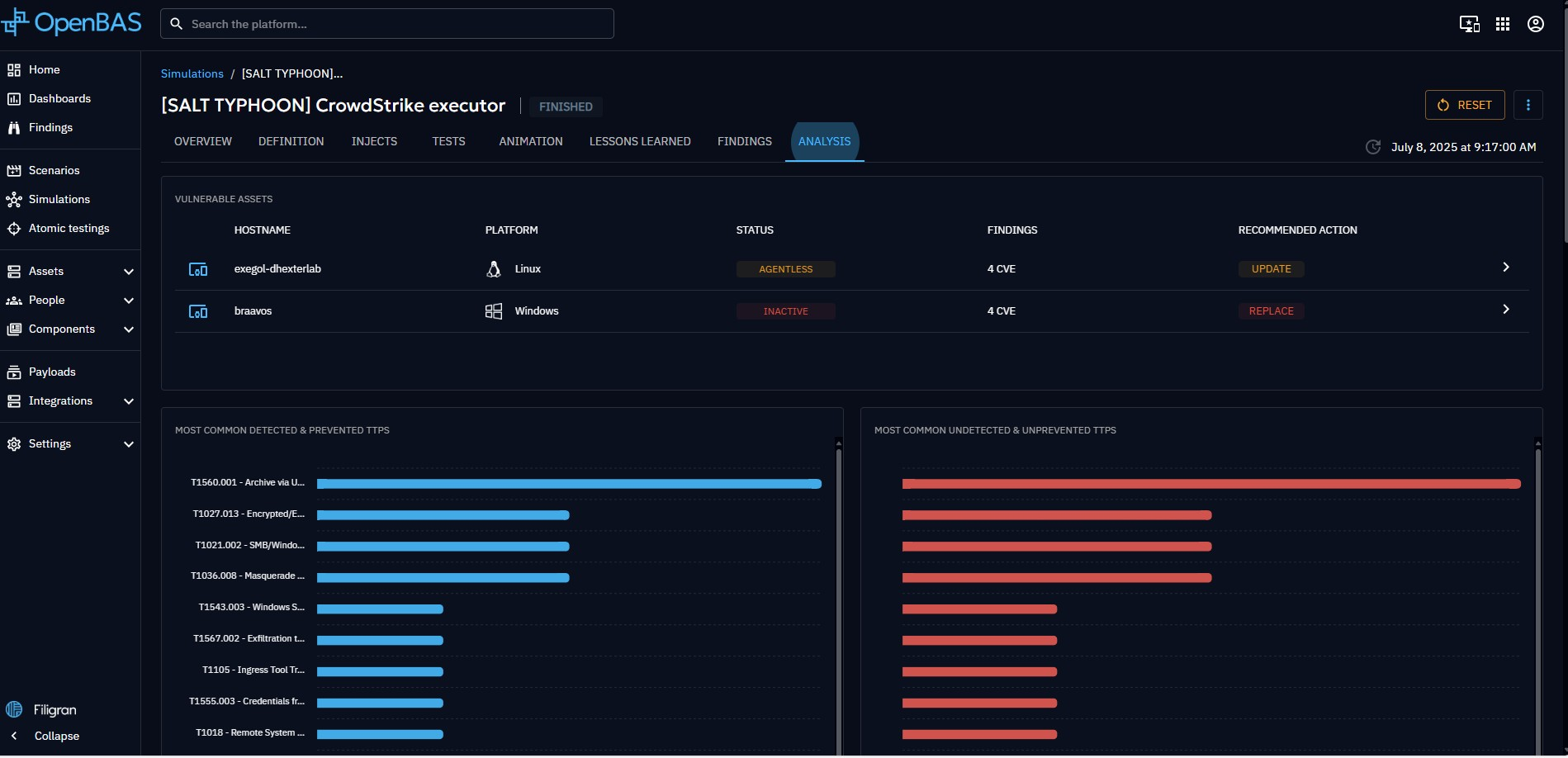 The Analysis tab of a simulation is intended to enhance the data visualization and analytical capabilities of OpenBAS. By incorporating specific widgets, users can gain deeper insights into the effectiveness of their simulations and security posture. This enhancement will provide users with contextualized, actionable intelligence, enabling them to make informed decisions to improve their security strategies.