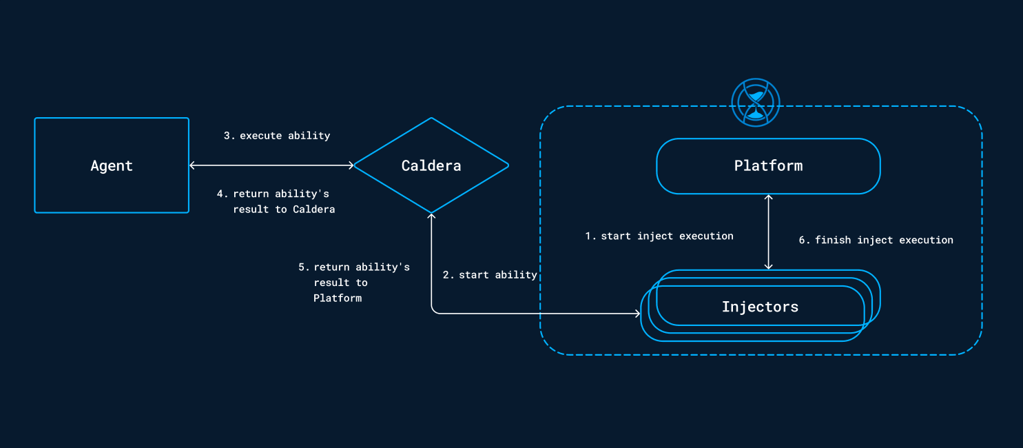 Once the agents are deployed, simulations with Caldera injects can be executed. The platform will contact the agent to start the ability. Subsequently, the agents will report the results to OpenBAS. Below is the workflow illustrating the behavior of injects.
