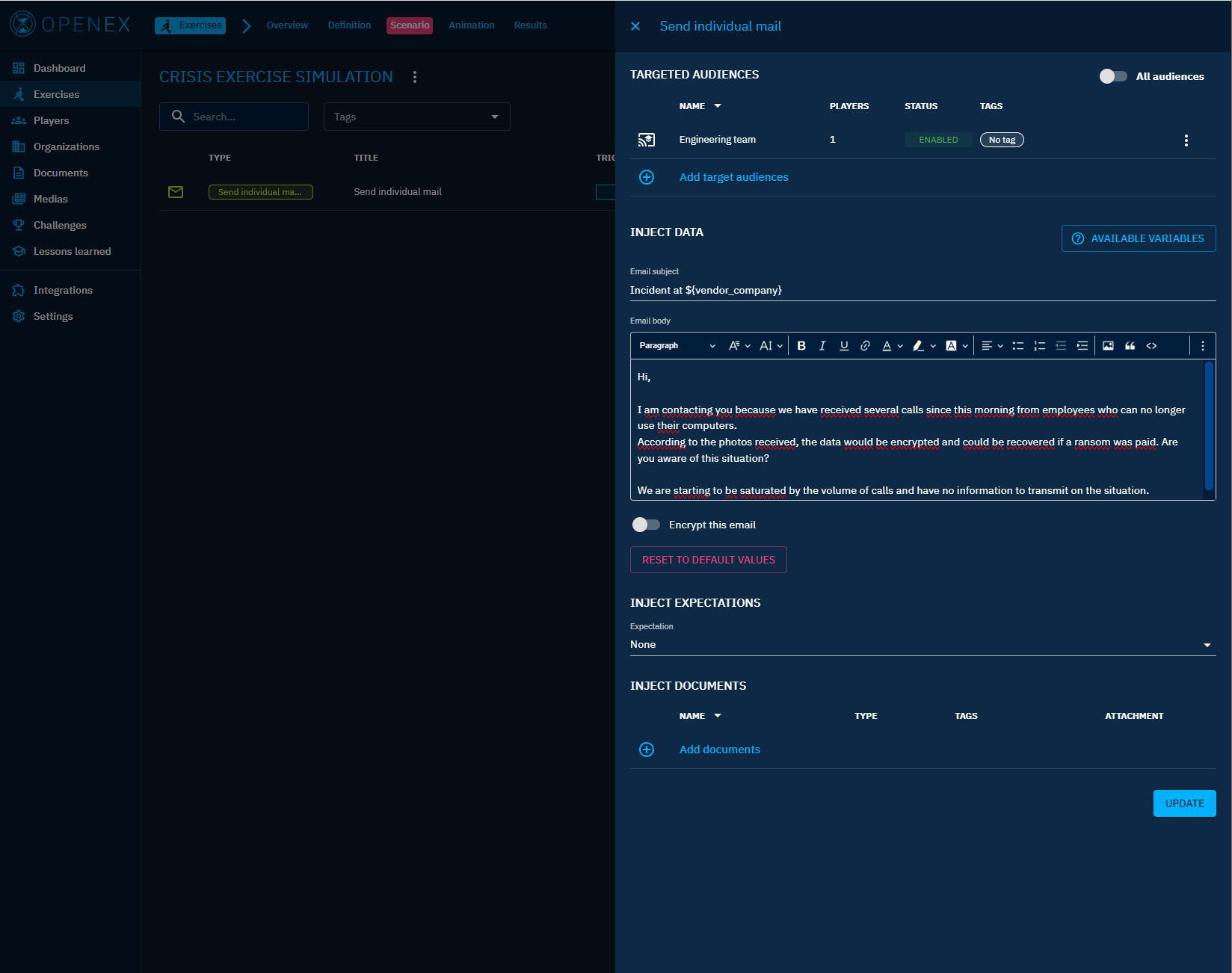 Within certain injects, users can leverage a set of predefined built-in variables to dynamically customize content. These variables are designed to streamline the process of personalizing messages. Examples of built-in variables include but not limited to :