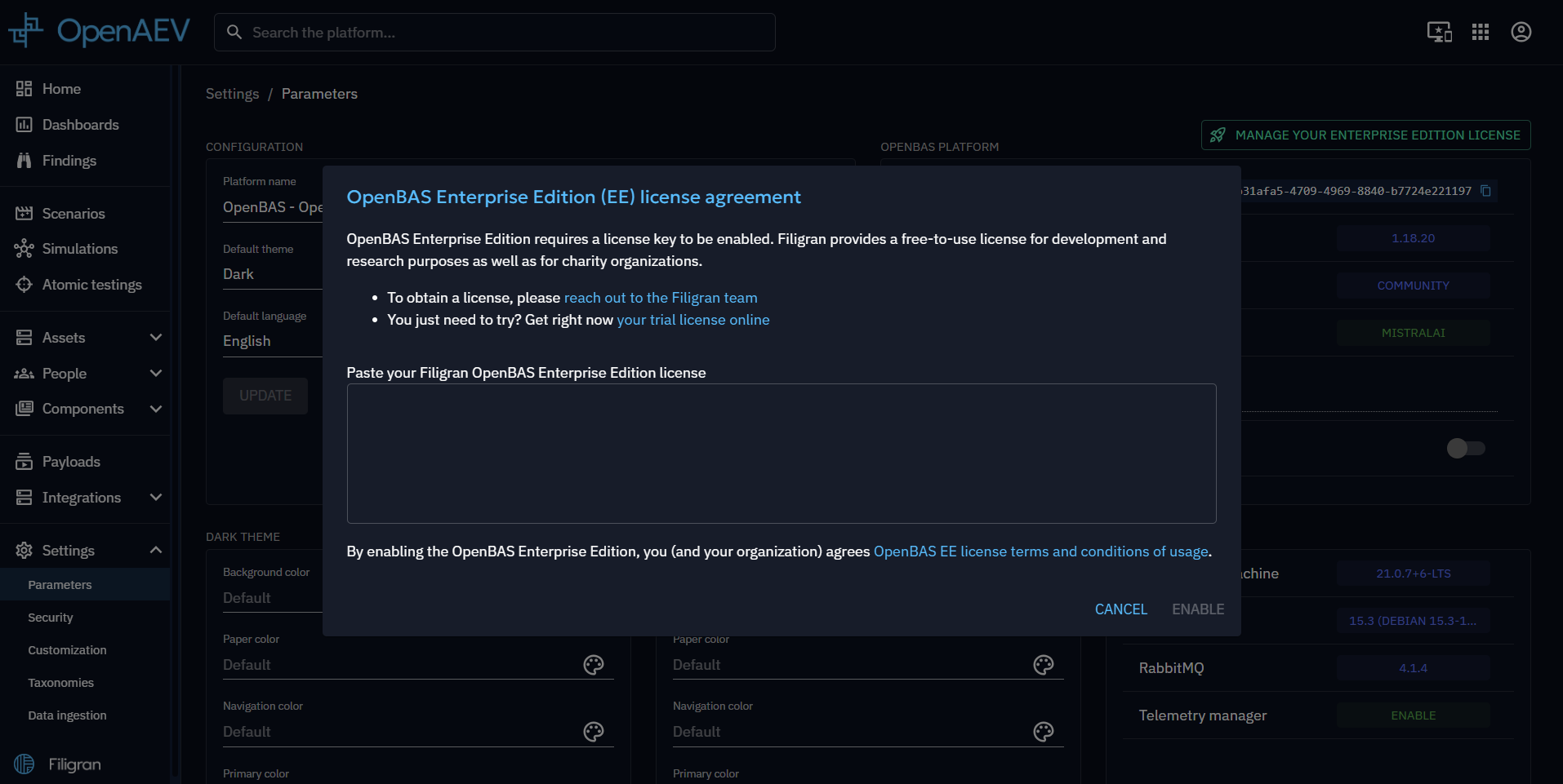 Then you will need to put a valid OpenAEV EE license. If you don't have it, you can generate a trial license.