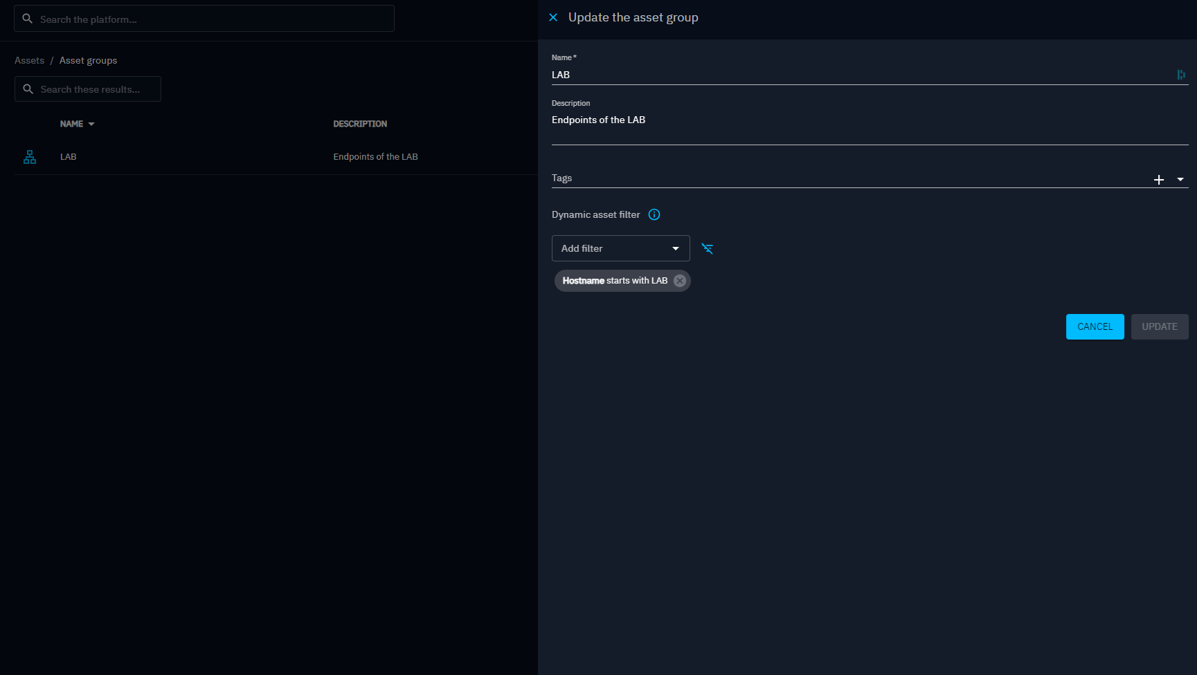 When creating a new asset group, administrators have the flexibility to specify the filters that will delineate the group's membership. Currently, the platform offers a range of filters such as platform type, hostname, and IP addresses. We plan to extend the possibilities by including additional filters in future updates.
