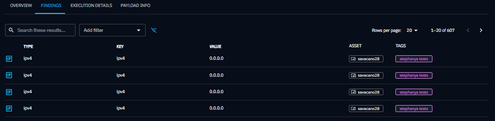 The findings results and the details of the output parser will also be available in the Findings and Payload Info tabs of the Atomic Testing Detail View.