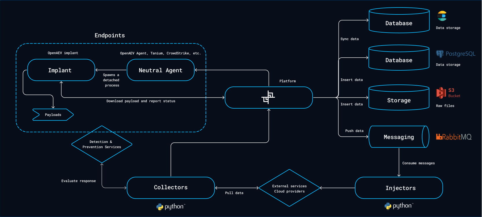 The OpenAEV platform relies on several external databases and services in order to work.