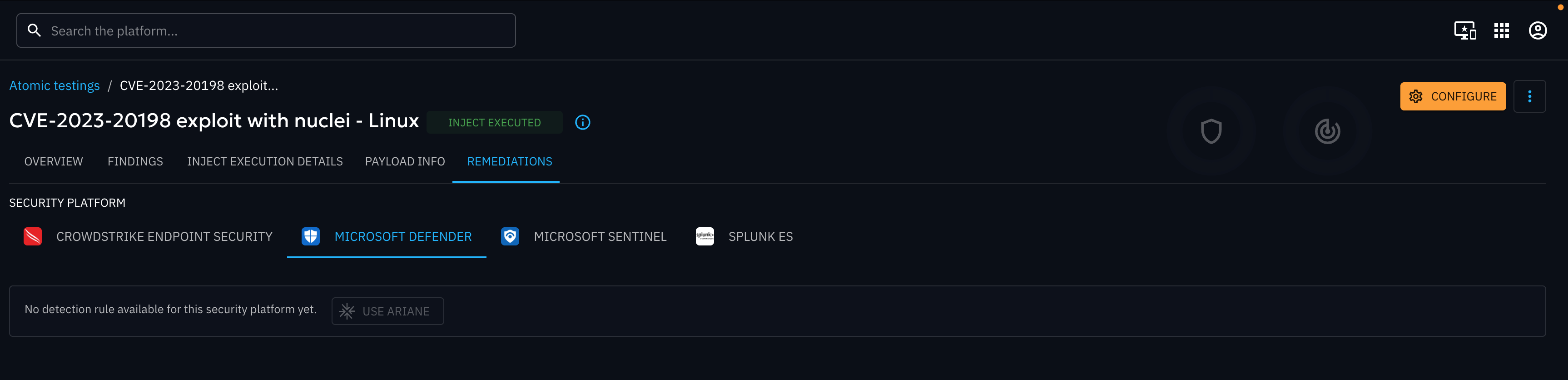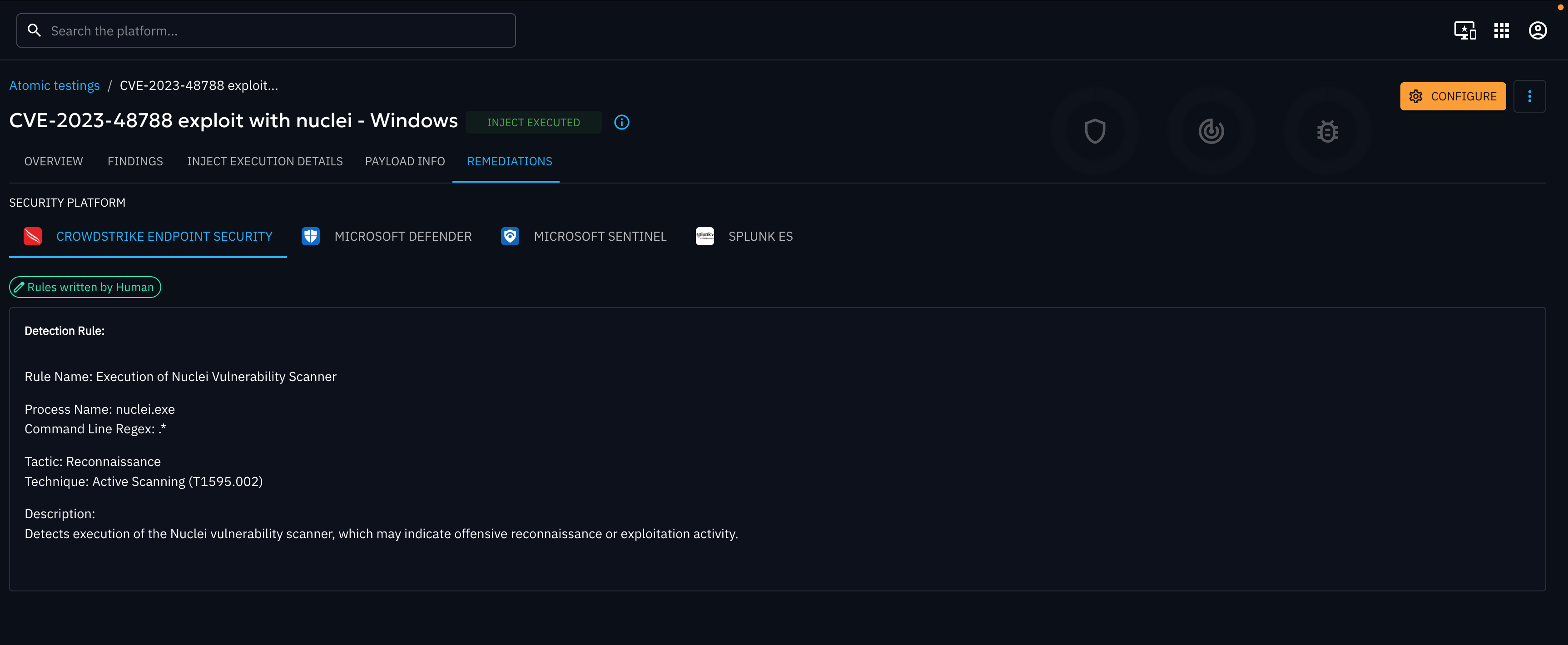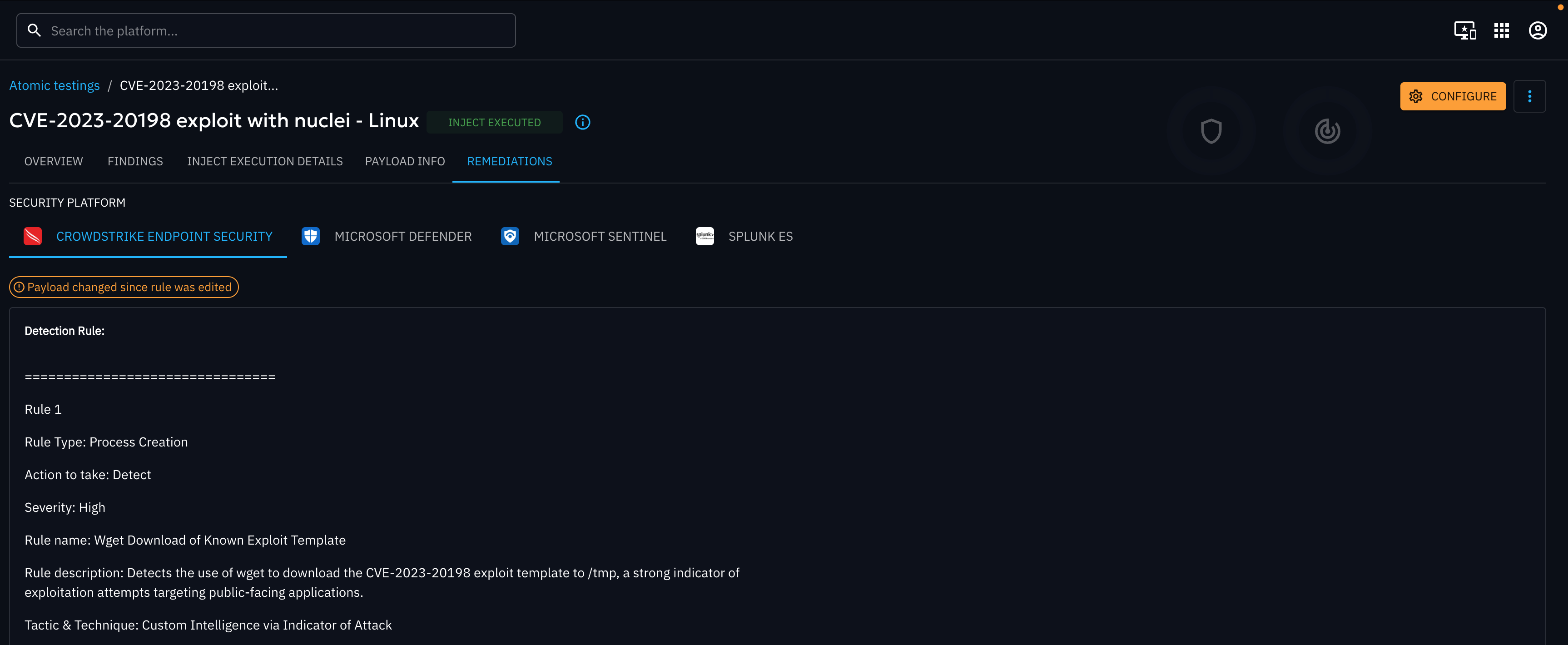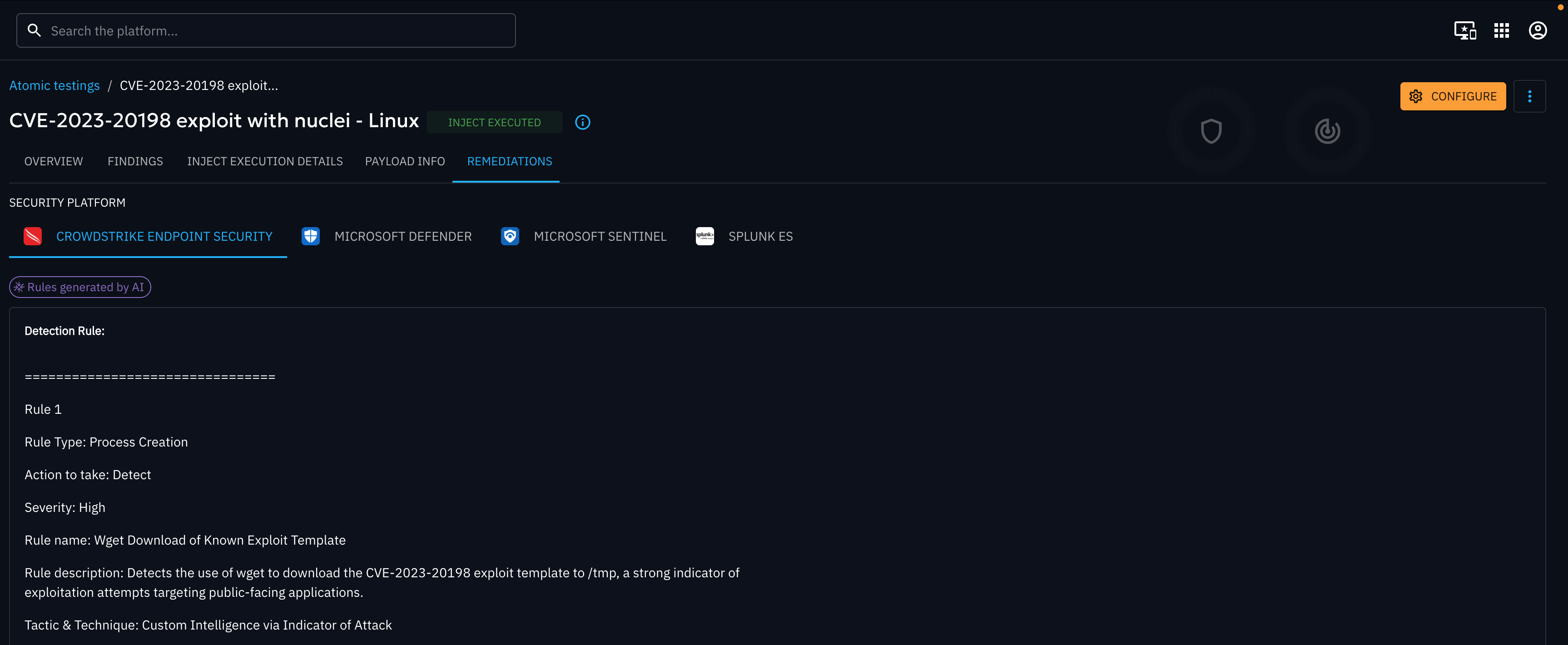 This screen is available for technical injects only. It displays remediation content related to the executed payload, specifically focused on detection logic. You will see one Remediation tab per collector available in the platform.