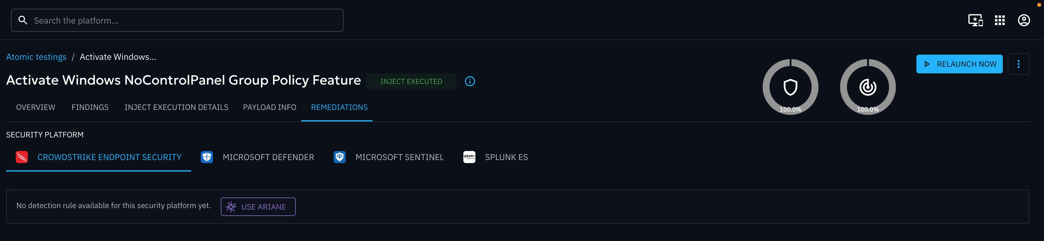 The first screen displayed when you click on a specific inject executed (Atomic testing or Simulation) is a breakdown of your security posture against this test.