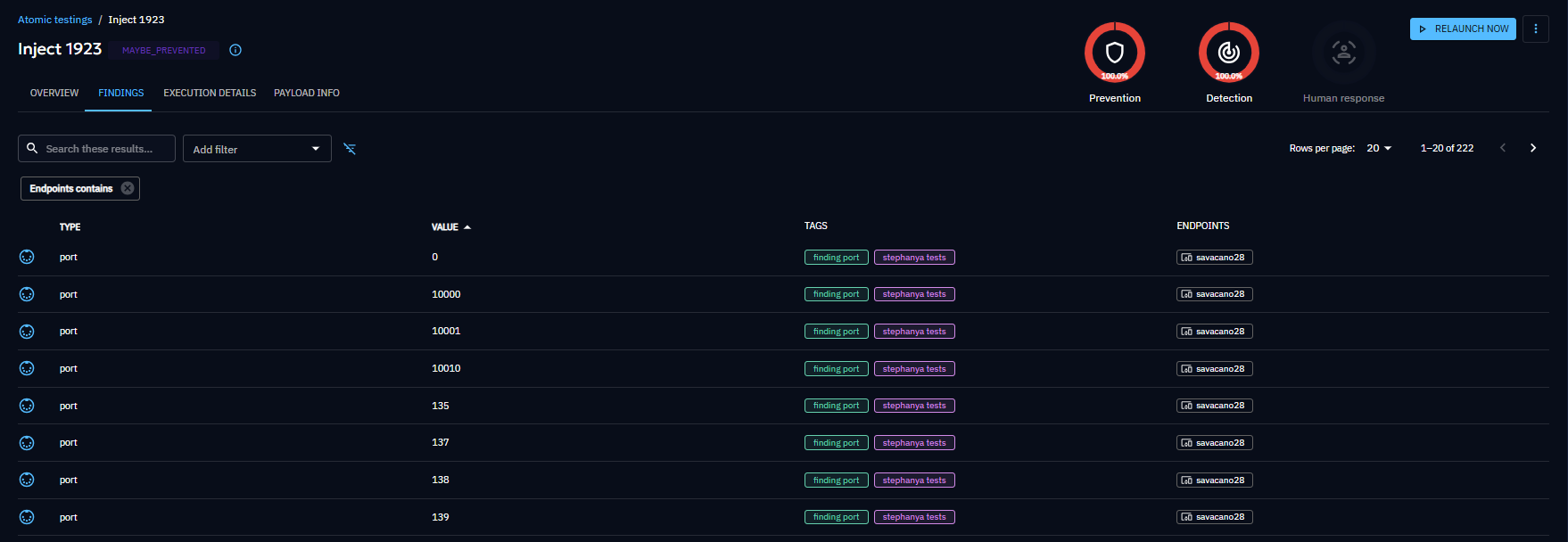 The Findings screen displays what was detected during the inject, based on the output parser in the payload. You can filter findings by name, type, creation date, target, value, or tag.