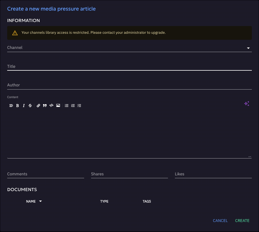 - In Scenarios, when creating an article, the user also needs the capability to access Channels.