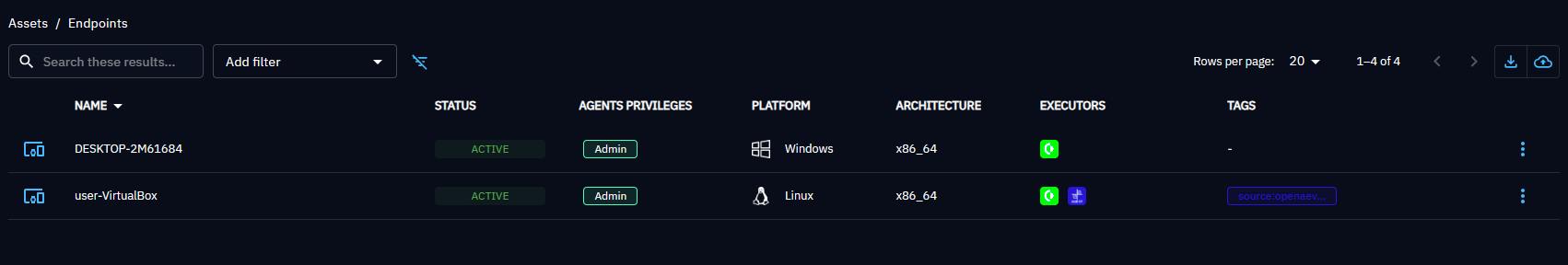 NB : An Asset can only have one Palo Alto Cortex agent installed due to the uniqueness of the MAC address parameters. If you try to install again a Palo Alto Cortex agent on a platform, it will overwrite the actual one and you will always see one Endpoint on the OpenAEV endpoint page.