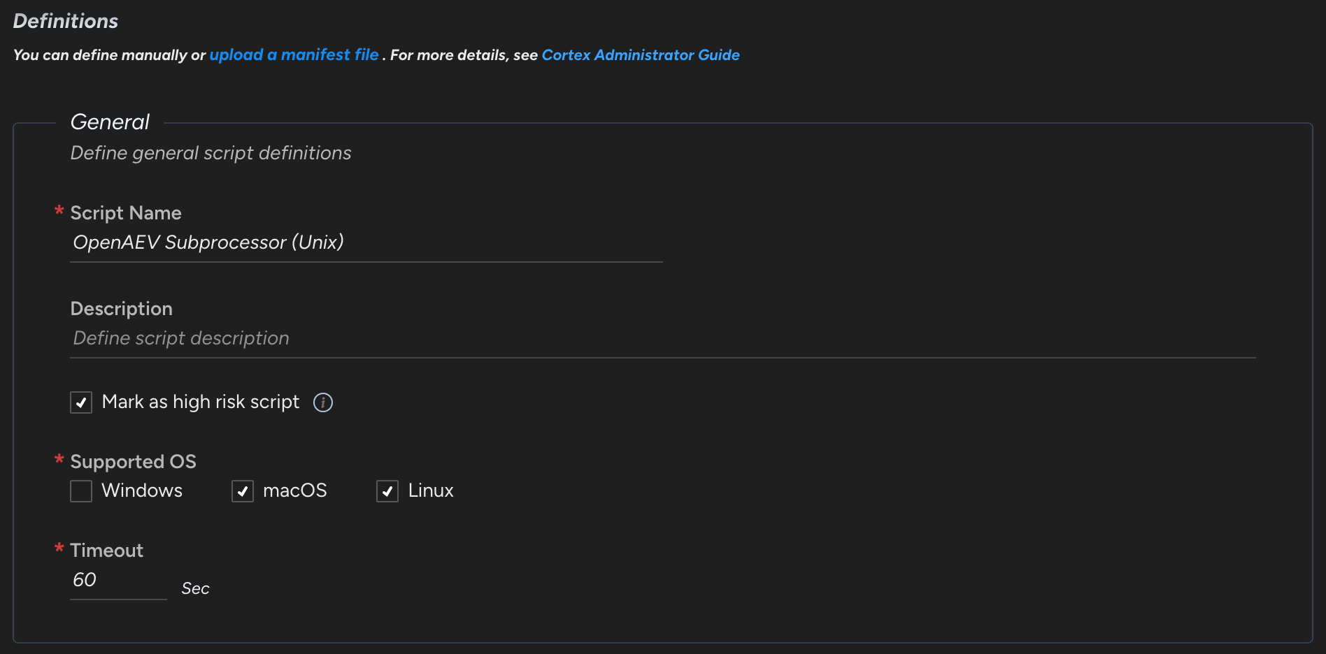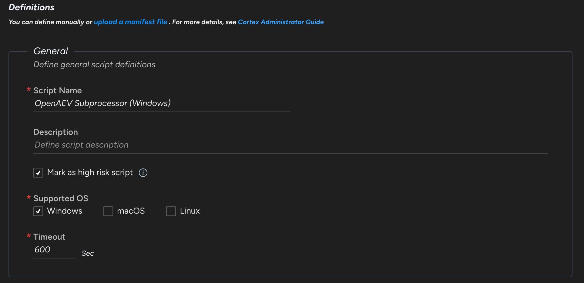 | executor.paloaltocortex.windows-script-uid | EXECUTOR_PALOALTOCORTEX_WINDOWS_SCRIPT_UID | Uid of the OpenAEV Palo Alto Cortex Windows script | |